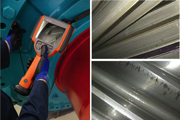 使用便攜式工業視頻內窺鏡,便于攀爬風塔實施檢測;而且利用探頭的攝像能力,檢測人員無需對風機進行解體,就可以在手持機顯示屏上看到齒輪箱內部的實際狀況,了解齒輪箱齒面、行星級軸承、中速級軸承以及高速級軸承是否存在磨損等缺陷。通過定期或者在少風時節開展內窺檢測,可以提前發現齒輪箱潛在故障,為維修決策爭取時間。